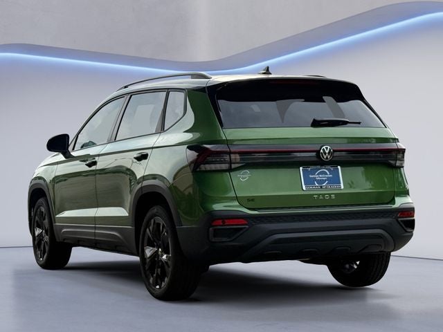 Bright Moss Green/Blk Rf 2026 Volkswagen Taos 1.5T SE Black FWD 8-Speed Automatic with Tiptronic 4-Wheel Disc Brakes, 6 Speakers, ABS brakes, Active Blind Spot Monitor, Air Conditioning, Alloy wheels, AM/FM radio: SiriusXM with 360L, Auto High-beam Headlights, Automatic temperature control, Brake assist, Bumpers: body-color, Cloudtex and Cloth Seating Surfaces, Compass, Delay-off headlights, Driver door bin, Driver vanity mirror, Dual front impact airbags, Dual front side impact airbags, Electronic Stability Control, Emergency communication system: VW Car-Net Safe & Secure 5-year, Exterior Parking Camera Rear, Front anti-roll bar, Front Bucket Seats, Front Center Armrest, Front dual zone A/C, Front reading lights, Front Strut Rear Torsion Beam Suspension, Front wheel independent suspension, Fully automatic headlights, Heated door mirrors, Heated Front Bucket Seats, Heated front seats, Heated steering wheel, Illuminated entry, Leather Shift Knob, Low tire pressure warning, Occupant sensing airbag, Outside temperature display, Overhead airbag, Overhead console, Panic alarm, Passenger door bin, Passenger vanity mirror, Power door mirrors, Power driver seat, Power moonroof, Power steering, Power windows, Radio data system, Radio: MIB3 Composition Media AM/FM/HD, Rain sensing wipers, Rear anti-roll bar, Rear seat center armrest, Rear window defroster, Rear window wiper, Remote keyless entry, Security system, Speed control, Speed-sensing steering, Split folding rear seat, Spoiler, Steering wheel mounted audio controls, Tachometer, Telescoping steering wheel, Tilt steering wheel, Traction control, Trip computer, Variably intermittent wipers, and Wheels: 18 Black Painted Alloy. 1.5L I4 Turbocharged DOHC 16V LEV3-SULEV30 174hp