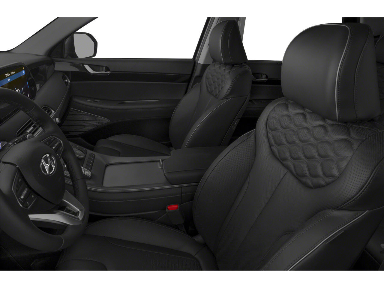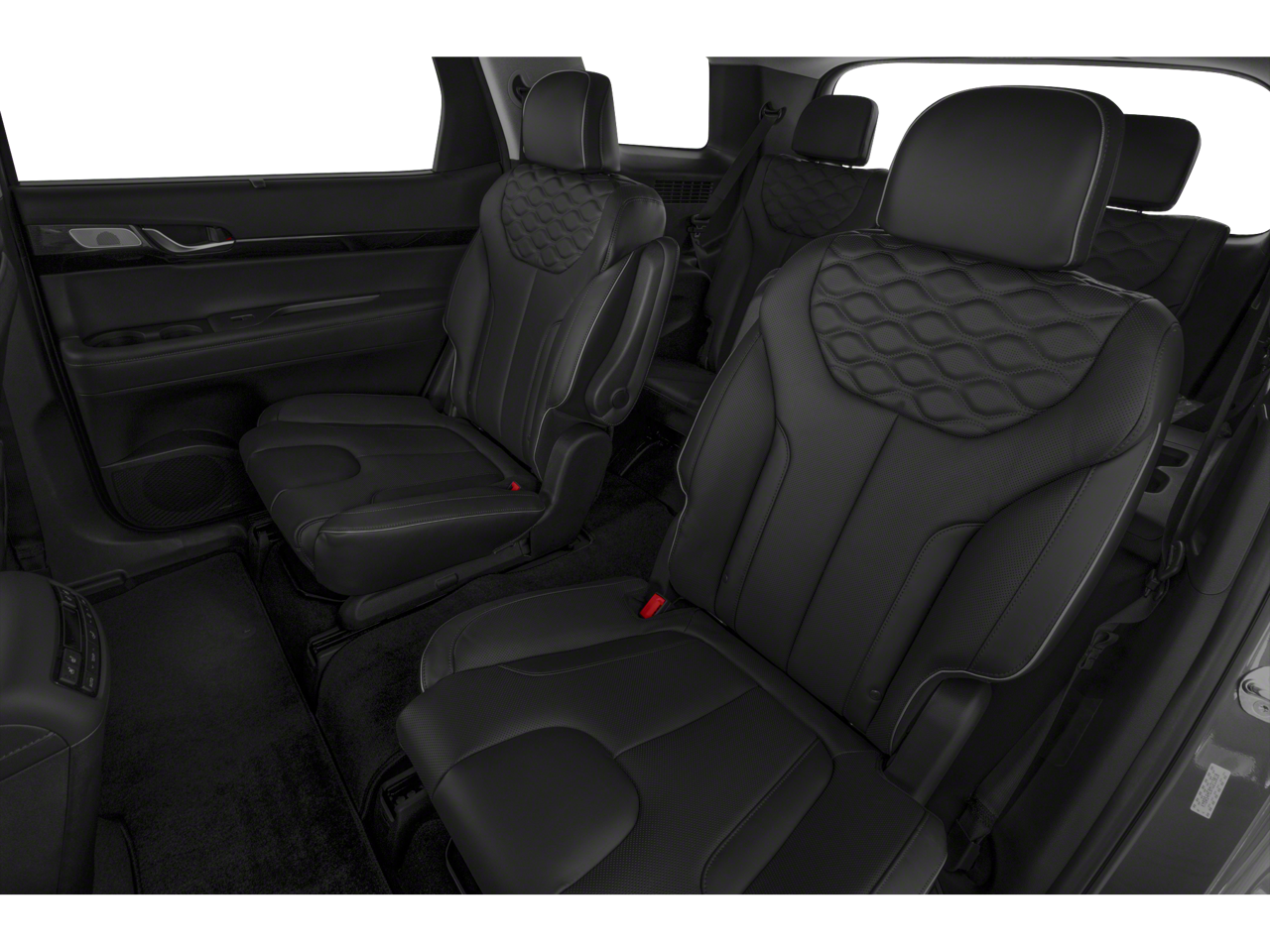 Option Group 01, 12 Speakers, 3.648 Axle Ratio, 3rd row seats: split-bench, 4-Wheel Disc Brakes, ABS brakes, Air Conditioning, Alloy wheels, AM/FM radio: SiriusXM, Apple CarPlay & Android Auto, Auto High-beam Headlights, Auto-dimming Rear-View mirror, Auto-leveling suspension, Automatic temperature control, Brake assist, Bumpers: body-color, Cargo Cover/Screen, Cargo Net, Cargo Tray, Carpeted Floor Mats, Compass, Delay-off headlights, Driver door bin, Driver vanity mirror, Dual front impact airbags, Dual front side impact airbags, Electronic Stability Control, Emergency communication system: Blue Link Connected Car Service (3-year complimentary subscription), Four wheel independent suspension, Front anti-roll bar, Front Bucket Seats, Front Center Armrest, Front dual zone A/C, Front reading lights, Fully automatic headlights, Garage door transmitter: HomeLink, harman/kardon® Speakers, Heads-Up Display, Heated & Ventilated Front Bucket Seats, Heated door mirrors, Heated front seats, Heated rear seats, Heated steering wheel, Illuminated entry, Knee airbag, Low tire pressure warning, Memory seat, Navigation System, Occupant sensing airbag, Outside temperature display, Overhead airbag, Overhead console, Panic alarm, Passenger door bin, Passenger vanity mirror, Power door mirrors, Power driver seat, Power Liftgate, Power moonroof, Power passenger seat, Power steering, Power windows, Premium Nappa Leather Seat Trim, Radio data system, Radio: AM/FM/MP3 Premium Audio System, Rain sensing wipers, Rear air conditioning, Rear anti-roll bar, Rear audio controls, Rear reading lights, Rear window defroster, Rear window wiper, Reclining 3rd row seat, Remote keyless entry, Security system, Speed control, Speed-sensing steering, Split folding rear seat, Spoiler, Steering wheel mounted audio controls, Tachometer, Telescoping steering wheel, Tilt steering wheel, Traction control, Trip computer, Turn signal indicator mirrors, Variably intermittent wipers, Ventilated front seats, Ventilated rear seats, Wheel Locks, and Wheels: 20 x 7.5J Split 5-Spoke Machined Alloy.